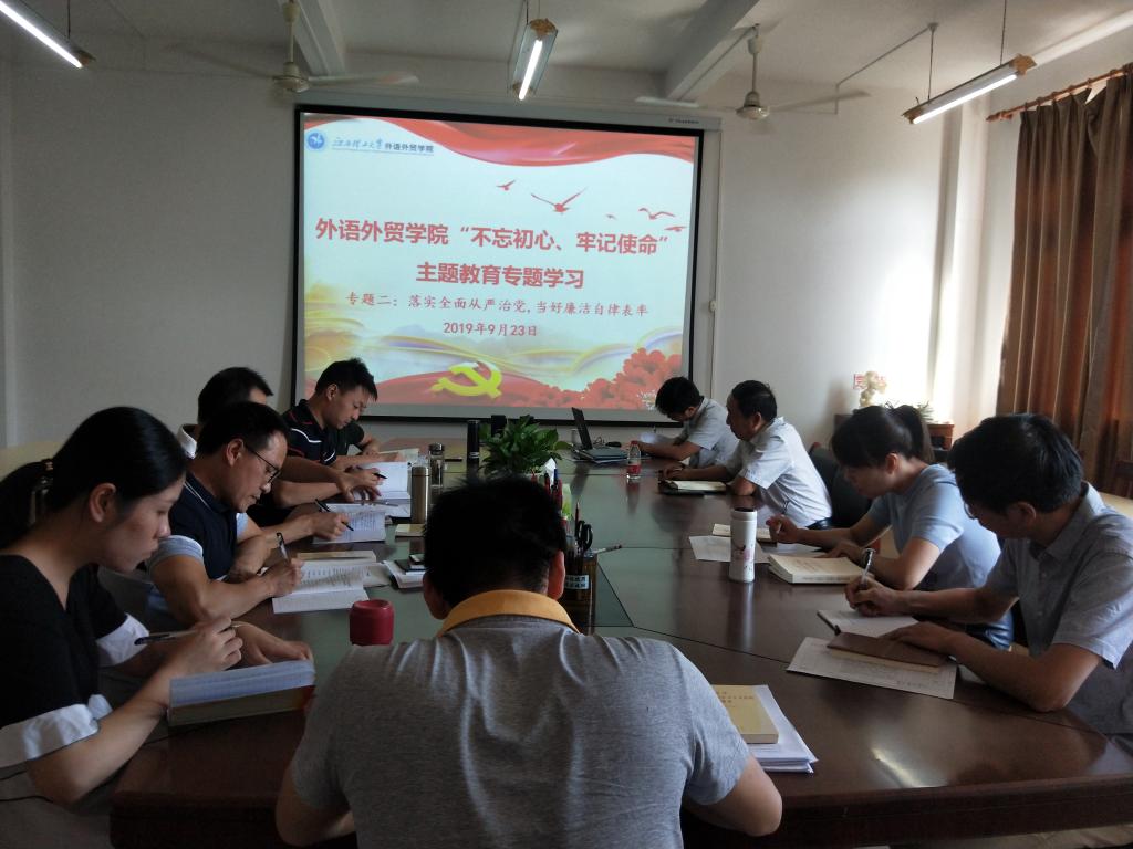 会上,副院长程渊围绕主题教育专题二学习内容“落实全面从严治党,当好廉洁自律表率”进行导学。他指出:“清正廉洁,是共产党人的做人之本,是领导干部的为政之基。始终保持清廉的政治本色,是推进新时代党的建设的必然要求。领导干部特别是高级干部要明大德、守公德、严私德,做廉洁自律、廉洁用权、廉洁齐家的模范。”并带领与会人员集中学习了《中国共产党廉洁自律准则》《习近平同志在中共十八届六中全会第二次全体会议上的讲话》《中国共产党问责条例》等学习内容,与会人员围绕本次专题学习内容并联系自身思想和工作实际进行了研讨交流。
