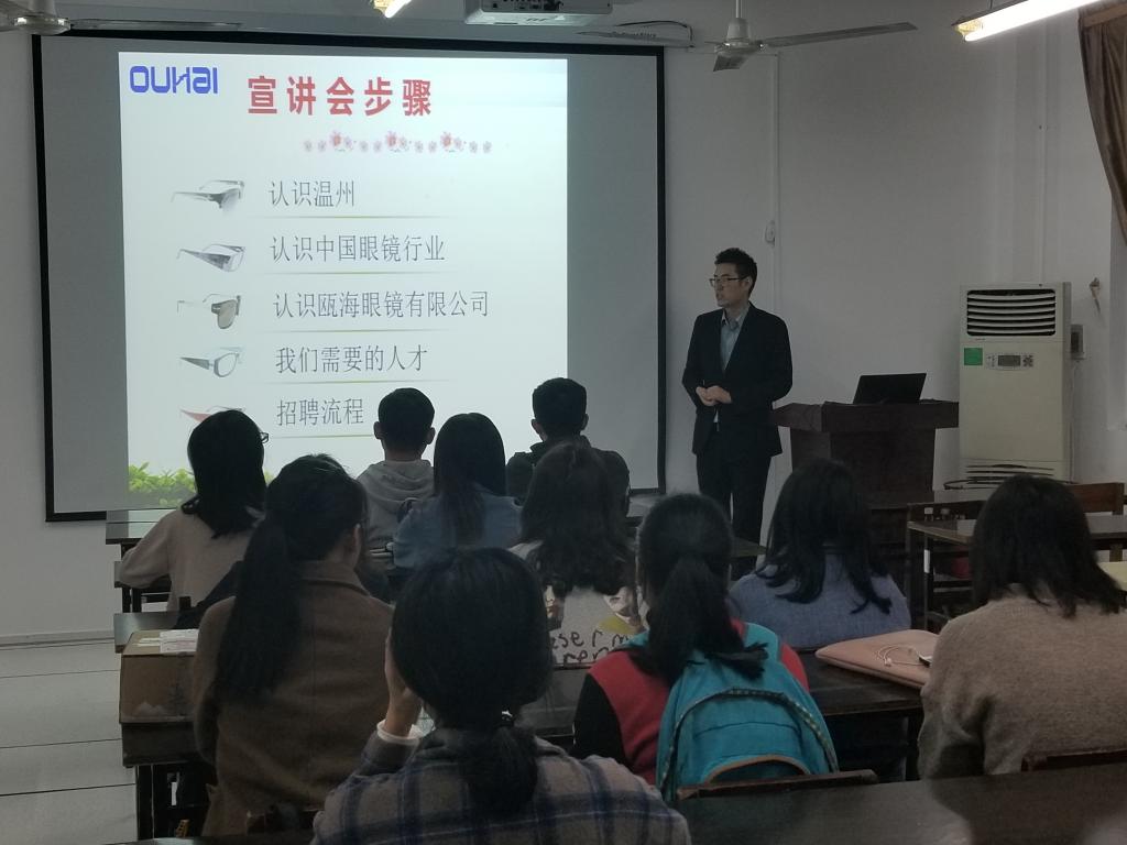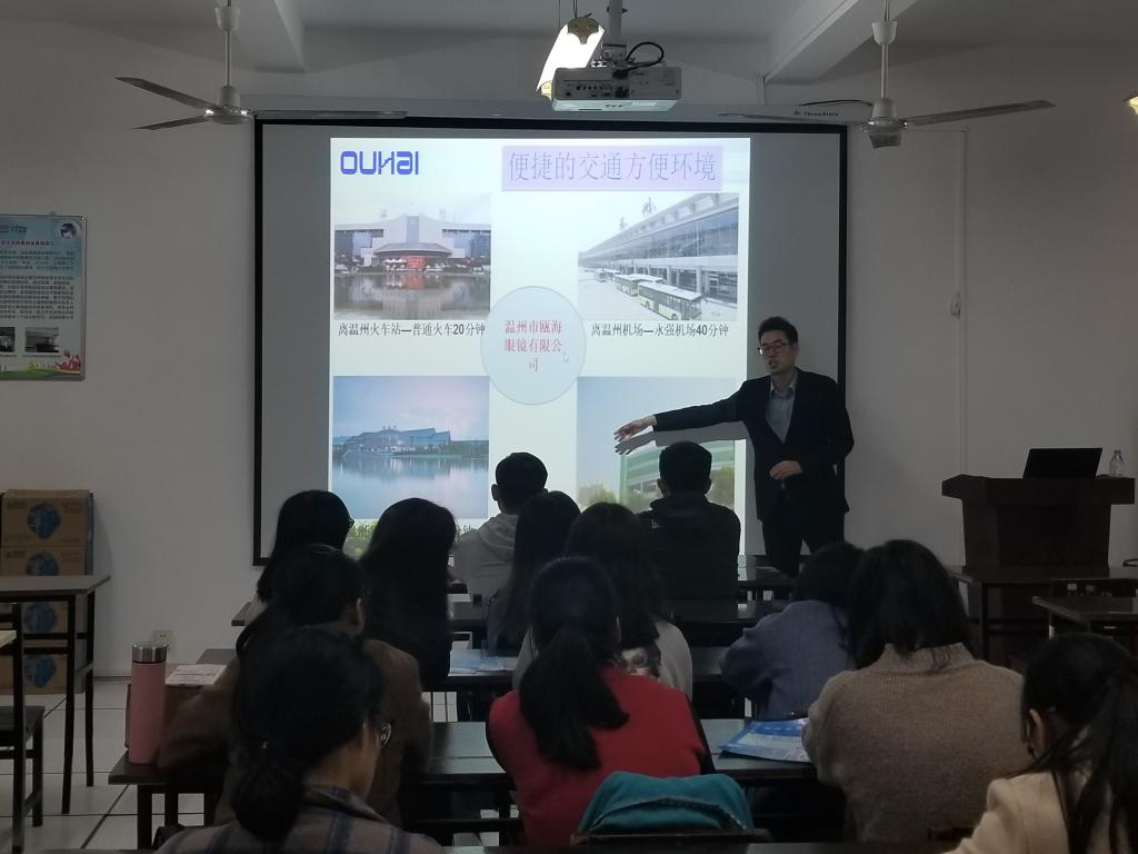 公司负责人刘经理围绕“认识温州,认识中国眼镜行业,认识瓯海眼镜有限公司”三方面展开企业宣讲。首先,播放企业宣传片,介绍公司经营状况及招聘岗位、工作要求等具体内容;其次,着重讲解当地人才引进相关优惠政策,公司员工节假休息日、薪资福利等;最后,组织毕业生进行笔试与面试。