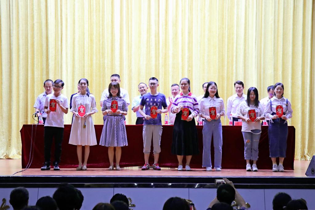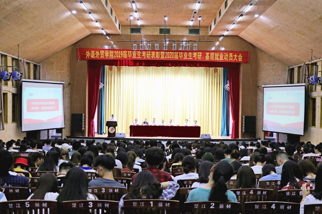 大会在雄壮的国歌声中拉开帷幕。会上,程渊首先宣读了《外语外贸开元(中国)关于表彰胡琪童等54名优秀考研同学的决定》,随后为考研同学代表进行了颁奖。据悉,今年全院共有54名毕业生被录取,其中保研7人,出国留学20名,考研升学率为22.78%, 比去年增长4.98个百分点。接着,2019届保研学生代表经贸152班钟聪红、考研学生代表英语151班罗斌分别向同学们介绍了自己的保研和考研心得。随后,邓晓宇宣读《外活外贸开元(中国)关于激励和组织在校本科生报考硕士研究生的奖励办法》。