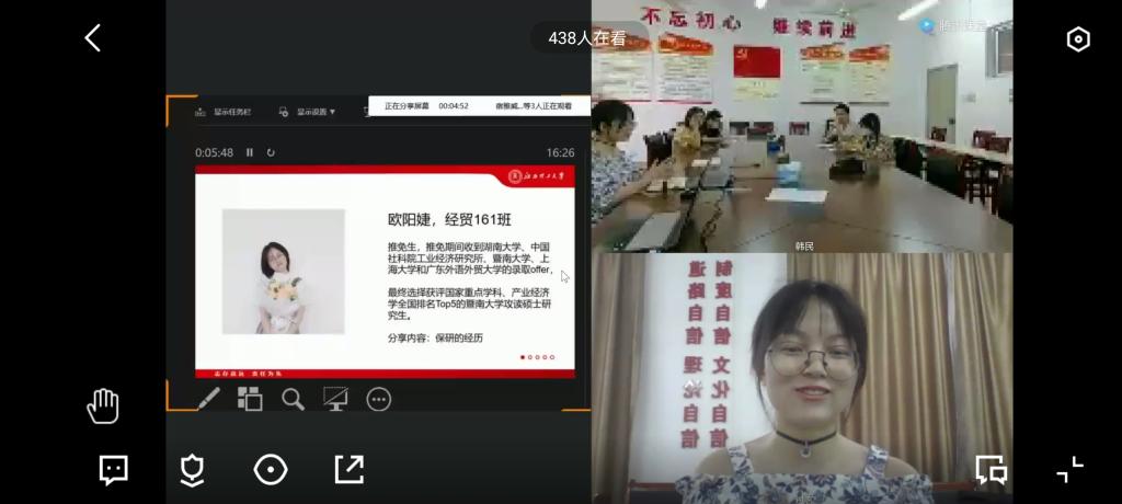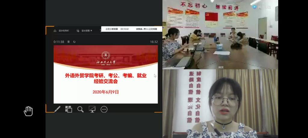 会上,开元网站登录入口16级七位优秀毕业生分别就他们的考研、考公、考编、就业经验及心得体会与在线的老师同学们做了深入的交流。成功保研暨南大学的欧阳婕从保研目标、保研流程以及相关信息的收集等方面就所需要注意的事项作了耐心细致的讲解,并鼓励学弟学妹努力提高专业成绩、多参加竞赛,为保研做准备。同样保研北京师范大学的谢琳鑫向大家分享了自己参加夏令营和面试的经历,并提醒在座的同学应尽早明确目标,从自身的实际出发,提前为保研或考研做好准备。成功上岸中山大学汉语国际教育专业的任能通过分享其院校选择和高效学习技巧的介绍,让同学们了解如何才能调整心态,高效备考;舒宇杰则对考研心路及备考方法经验、细致地量化了各科备考的流程,并强调了专业上基础知识要扎实,也对考研过程中是否找工作等问题进行解答。