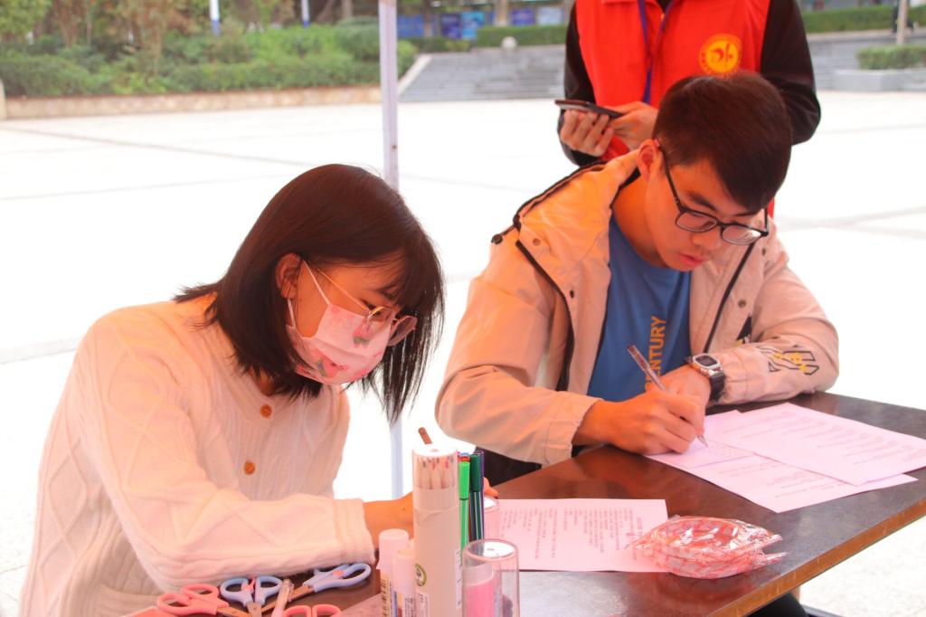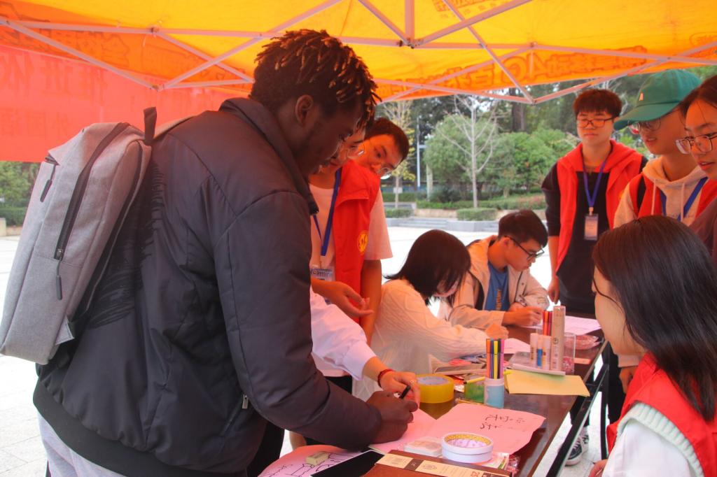 一笔一画学宪法。文化广场上,学习宪法活动正火热进行着。同学们踊跃参与,他们用心绘制宪法手抄报,不同颜色的搭配、不同图案的绘制,一笔一划勾勒出他们心中的“宪法精神”,通过图画弘扬宪法精神,展现了同学们学习宪法的热情和尊崇宪法的决心。活动现场,路过的留学生们也积极参与,他们试着学习如何书写“宪法”二字,一撇一捺,从汉字的角度了解宪法。在这一过程中,参与者一起交流宪法知识,比如“宪法精神”的含义等等,活动现场氛围十分热闹。