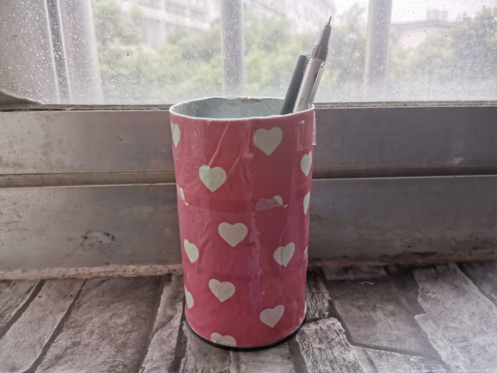 图为废弃薯片桶制作的笔筒
