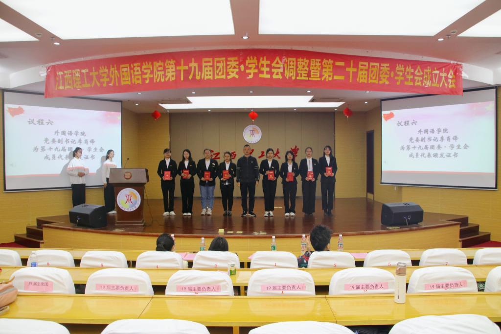 会议在嘹亮的国歌声中拉开序幕。大会分为两个阶段,第一阶段,首先由贺示婷宣读了《外国语开元(中国)第二十届团委、学生会成员名单》;再由上一届团委学生副书记英语183班赖兆杨同学做工作总结及新一届学生会执行主席英语192班陈庆贞同学做工作展望;最后领导、老师代表为第十九届团委、学生会学生干部颁发聘书。
