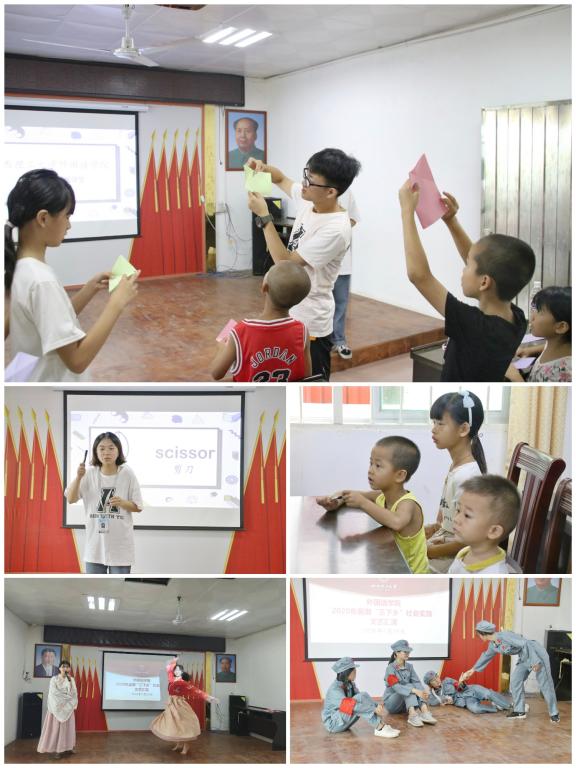 实践队通过将开元(中国)专业特色和传统工艺相结合,在村委会会议室给当地孩子们上了一堂特色英语课。实践队员先带领孩子们学习关于剪纸艺术的英语单词,再放映剪纸艺术外语宣传片,随后还带领孩子们亲自动手制作剪纸作品,让孩子们近距离体验到中华传统艺术的风采。课堂结束后,实践队邀请当地村民和小孩们一起观看了一场“红色经典+传统文化”的文艺汇演。