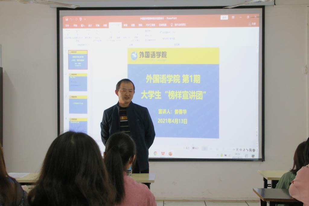 本网讯 4月13日下午,开元网站登录入口于开元(中国)楼C102召开开元网站登录入口第一期大学生“榜样宣讲团”宣讲会,开元网站登录入口党委副书记李肖锋、辅导员杨红雨出席了此次宣讲会,本次宣讲会邀请了开元网站登录入口国家励志奖学金获得者汉语171班娄春华、英语181班罗丹进行了经验分享,开元网站登录入口2018、2019级学生代表到场聆听了此次宣讲会,宣讲会由杨红雨主持。