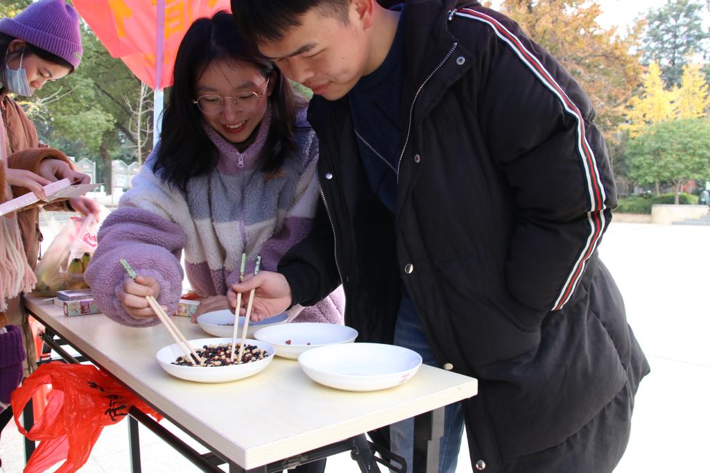 活动现场,同学们两两组队,用公筷将粮食夹到另一个盘中,先光盘者即可赢取礼品。同时,还设置有参加古诗挑战、或抄写或背诵与粮食有关的古诗词来获取奖品的游戏环节,“原来我们有这么多关于粮食节约的诗句,我作为一名大学生更加要把粮食节约落实到日常活动中去,发挥好中华民族的优秀传统美德。”参与活动的英语183班赖兆杨说道。此外,活动现场也吸引了一些小朋友参与。“春种一粒粟,秋收万颗子。四海无闲田,农夫犹饿死。”“小妹妹好棒呀,以后吃饭不要忘记农民伯伯的辛苦哦。”日语191班胡建红说到。