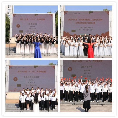 在缓缓的音乐声中,一首《送别》拉开了比赛的序幕。“天之涯,地之角,知交半零落”字字唱出了离别的万千愁绪。《勘探队之歌》舒展的旋律和强劲的曲调传达出革命乐观主义的精神,表达了一代人艰苦奋斗、不畏险阻的英雄气概。手执红旗,贴上国旗贴,一首《我和我的祖国》将我们的心与祖国紧紧连接在一起,热烈的爱国之情喷薄而出。“唱支山歌给党听,我把党来比母亲”,《唱支山歌给党听》用嘹亮的歌声、动人的旋律将党比作慈祥的母亲,表达了对党的衷心依恋和无比爱戴。活泼的曲调、跳跃的节奏、充满爱国情怀的《爱我中华》入耳。“国是我的国,家是我的家,我爱我的国,我爱我的家……”激情悠扬《国家》彰显了莘莘学子对国家的由衷歌颂。比赛现场气氛活跃,台上铿锵激情的歌声在回荡,台下观众深受感染,整个文化广场充满着振奋人心的红歌旋律。