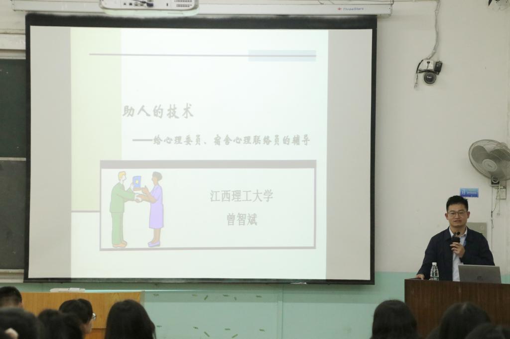 会上,曾智斌围绕“助人的技术——给心理委员、宿舍心理联络员的辅导”这一主题,从心理委员的助人态度、助人技术两个方面进行详实讲解。一方面,传达了对工作的态度、对同学的态度、对自己的态度,另一方面,他还分享了访谈技术、观察技术、主持技术、上报技术等助人技术,其中着重分析了访谈技术的倾听技术、重复技术、澄清技术等八大技术。随后,他结合生活中实际案例,分享了日常生活中如何与他人沟通交流、缓解情绪压力,并鼓励班委要主动了解并耐心引导求助者。最后,他还分享了学校及社会的心理服务资源。