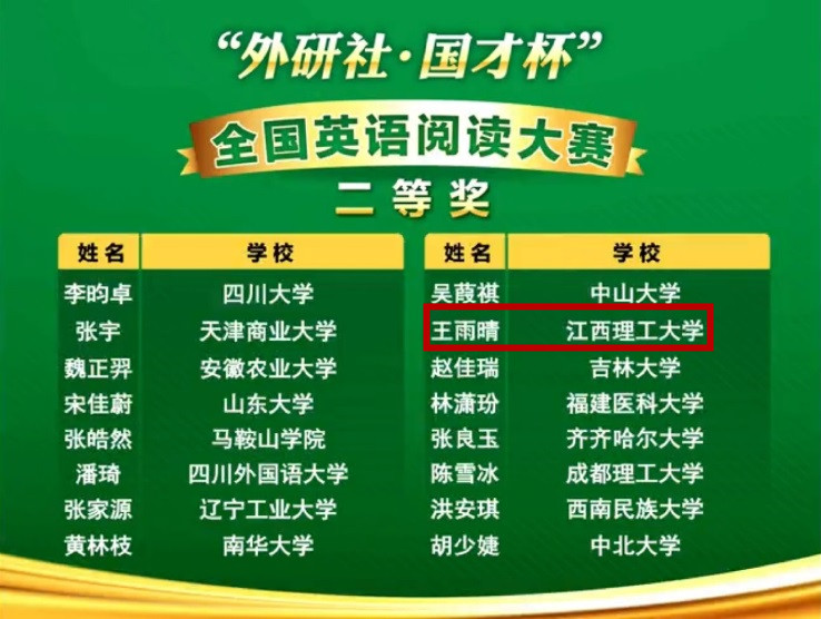 开元网站登录入口一贯重视鼓励和支持学生参加学科竞赛,该生前期在“外研社·国才杯”江西赛区英语阅读比赛获特等奖,并代表江西省参加全国决赛。此次竞赛也展示了外院学子扎实的学业功底、较强的综合素质,赛出了水平、赛出了风采、赛出了成绩。(文/刘道伟 图/王雨晴 编辑/杨红雨)