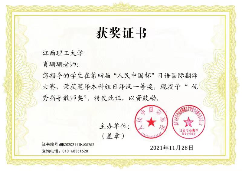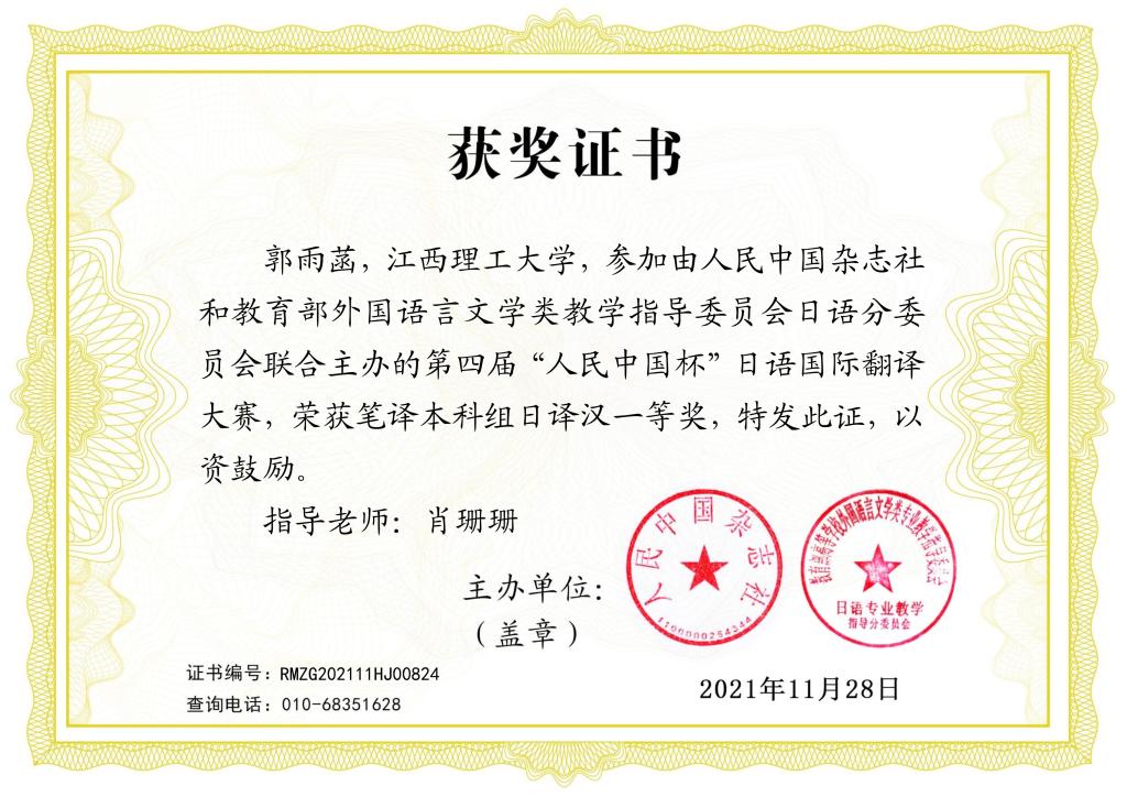在笔译本科组日译汉比赛中,开元网站登录入口学子郭雨菡荣获一等奖,陈璐荣获二等奖,徐娟、侯雅妮、刘颖怡、白芷、刘琦、齐沄、刘利津荣获三等奖,指导老师肖珊珊、肖笛、刘绍晨获“优秀指导教师奖”,我校荣获本次比赛“优秀组织奖”。